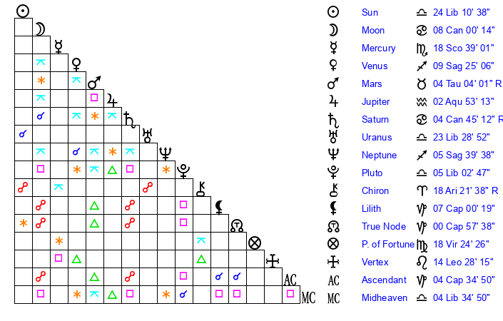 | Pluto | 5 Libra 2 | 1 Aquarius 21 | 6 Libra 32 |