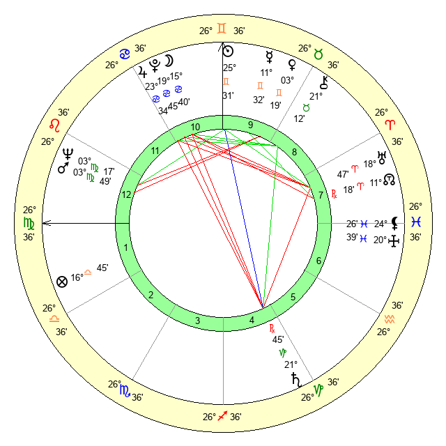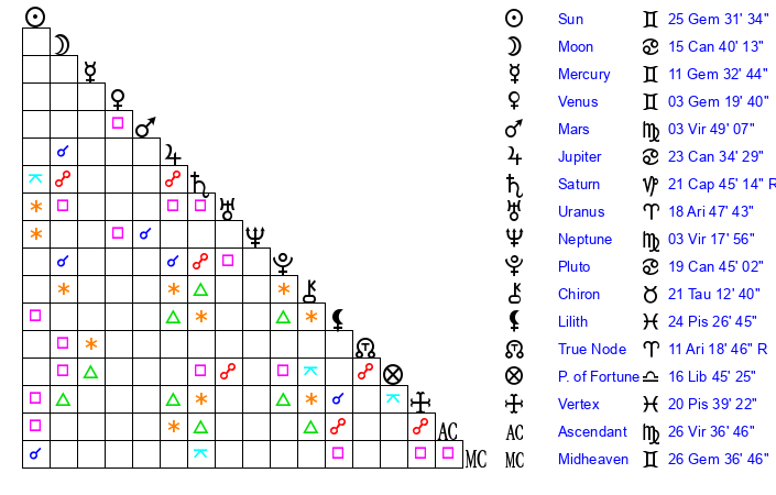 | Sun | 25 Gemini 31 | 26 Gemini 45 | 25 Virgo 47 |