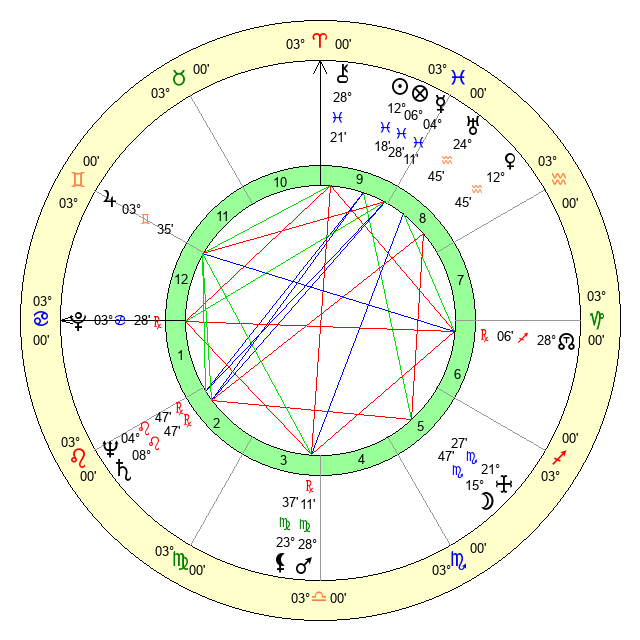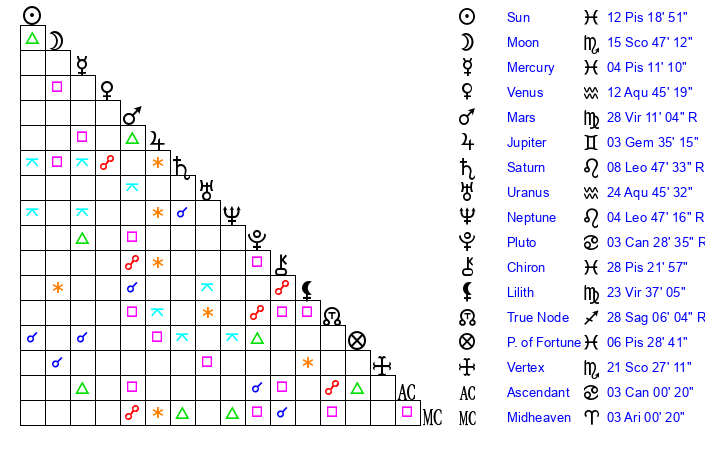 | Sun | 12 Pisces 19 | 13 Pisces 22 | 26 Gemini 37 |