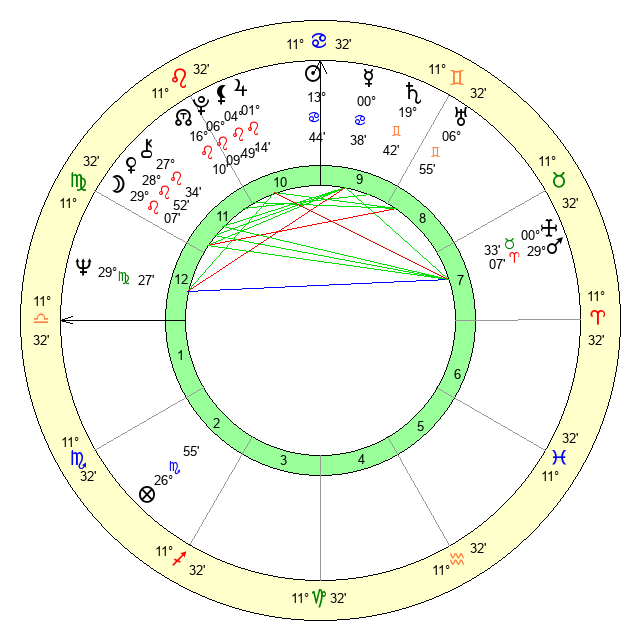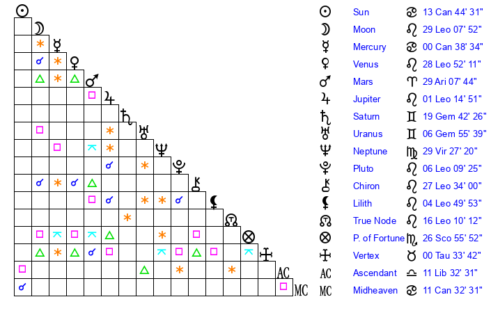 | Moon | 29 Leo 7 | 27 Scorpio 25 | 1 Virgo 48 |