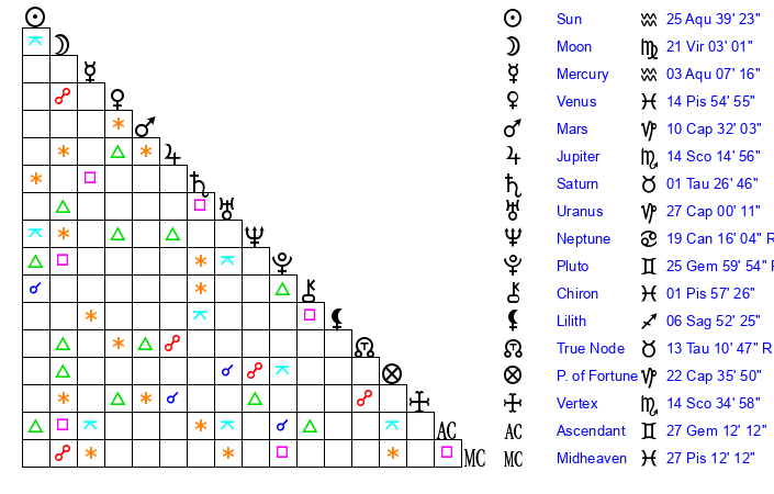 | Sun | 25 Aquarius 40 | 27 Aquarius 1 | 17 Gemini 29 |