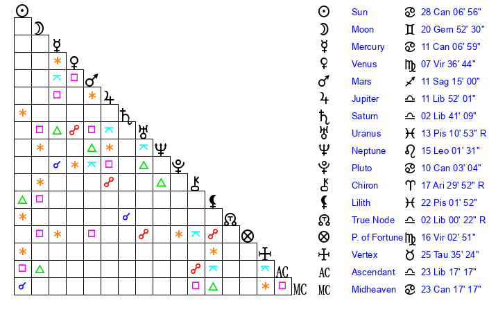 | Sun | 28 Cancer 7 | 29 Cancer 11 | 8 Scorpio 29 |