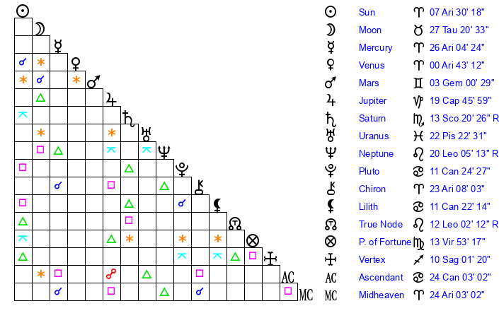 | Sun | 7 Aries 30 | 8 Aries 16 | 14 Cancer 4 |
