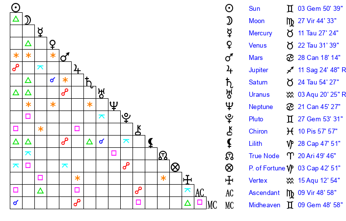 | Pluto | 27 Gemini 53 | 3 Aquarius 42 | 0 Cancer 2 |