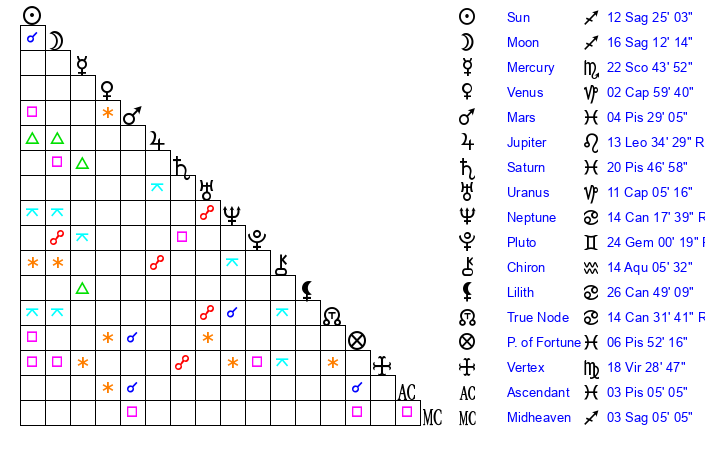 | Sun | 12 Sagittarius 25 | 13 Sagittarius 49 | 11 Aries 34 |