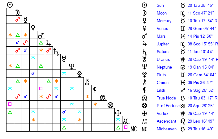 | Saturn | 11 Taurus 43 | 28 Pisces 51 | 20 Taurus 50 |