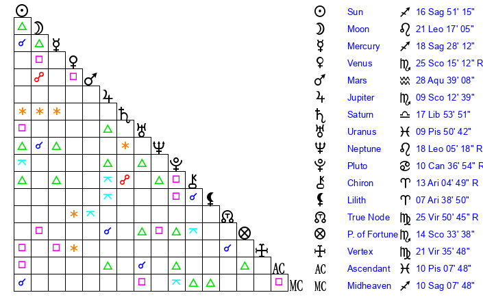 | Neptune | 18 Leo 4 | 29 Pisces 21 | 15 Leo 42 |
