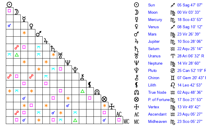| Moon | 0 Virgo 1 | 11 Pisces 51 | 24 Sagittarius 13 |