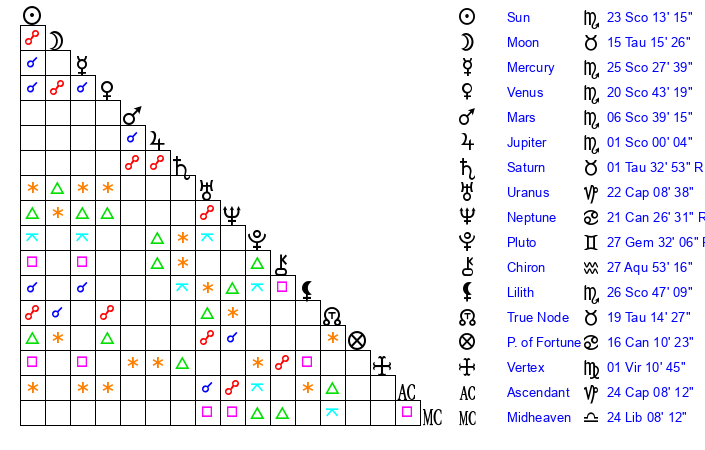 | Sun | 23 Scorpio 13 | 24 Scorpio 20 | 19 Pisces 46 |