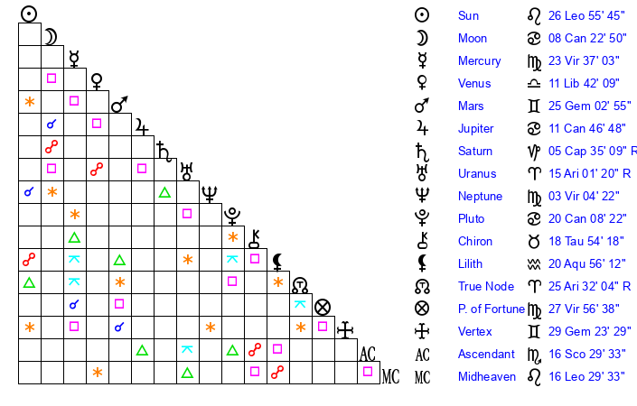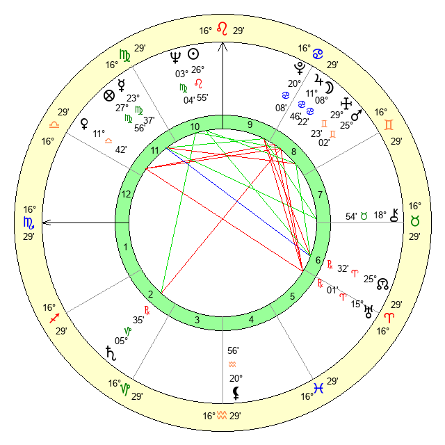 | Venus | 11 Libra 42 | 24 Cancer 4 | 29 Scorpio 9 |