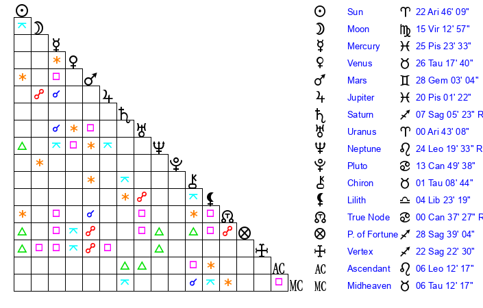 | Moon | 15 Virgo 9 | 1 Scorpio 27 | 14 Aries 51 |