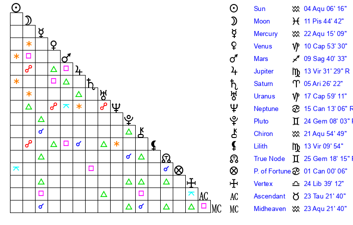 | Moon | 11 Pisces 36 | 6 Sagittarius 16 | 13 Gemini 52 |