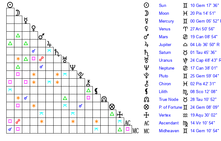 | Pluto | 25 Gemini 59 | 3 Aquarius 38 | 27 Gemini 56 |
