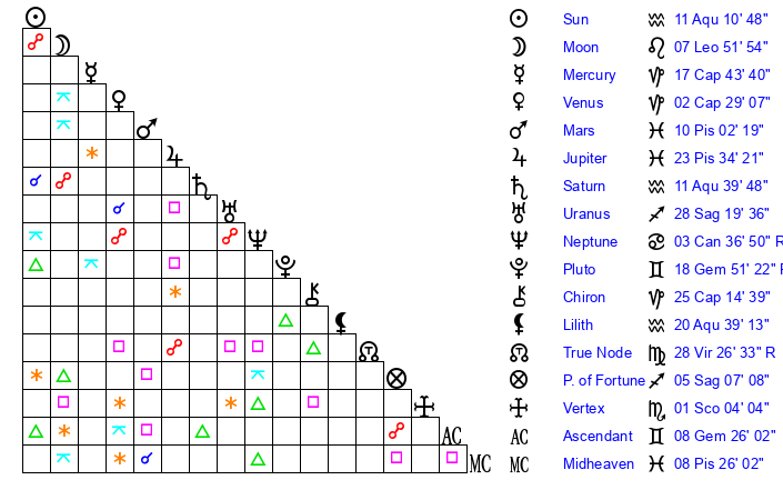 | Sun | 11 Aquarius 11 | 12 Aquarius 50 | 10 Gemini 29 |