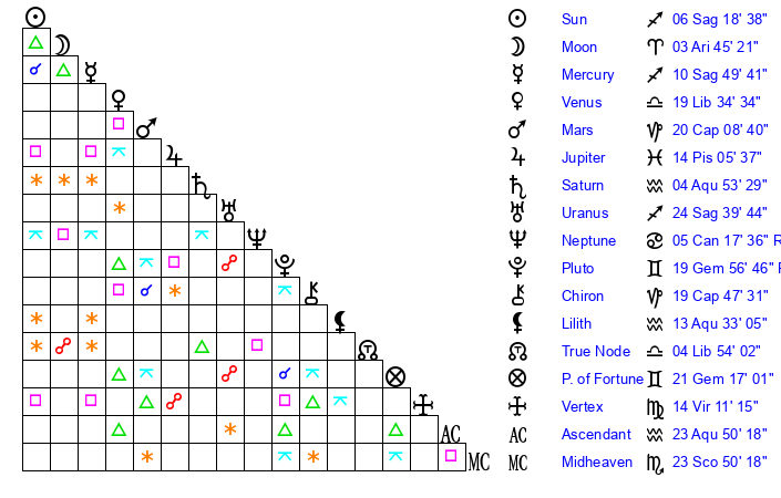 | Sun | 6 Sagittarius 18 | 7 Sagittarius 43 | 9 Aries 34 |
