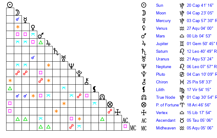 | Sun | 20 Capricorn 41 | 21 Capricorn 44 | 7 Taurus 35 |