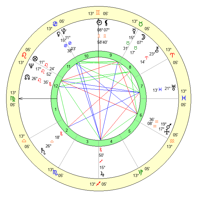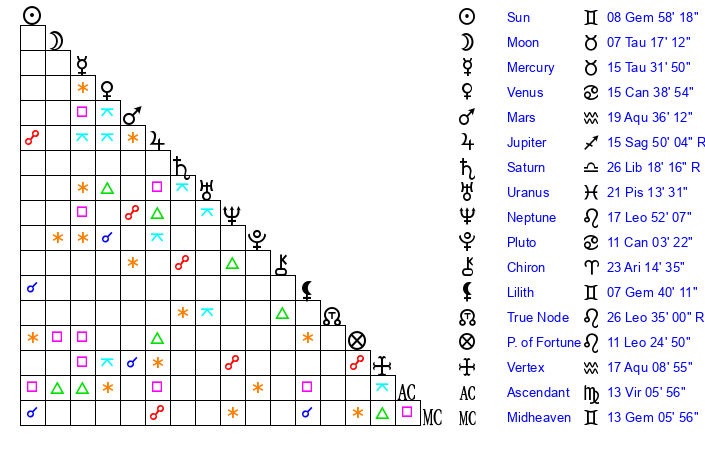 | Sun | 8 Gemini 58 | 9 Gemini 32 | 15 Virgo 44 |