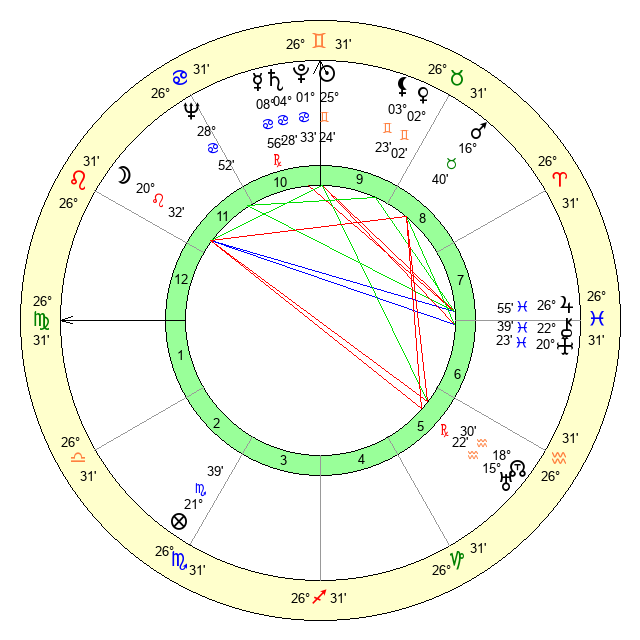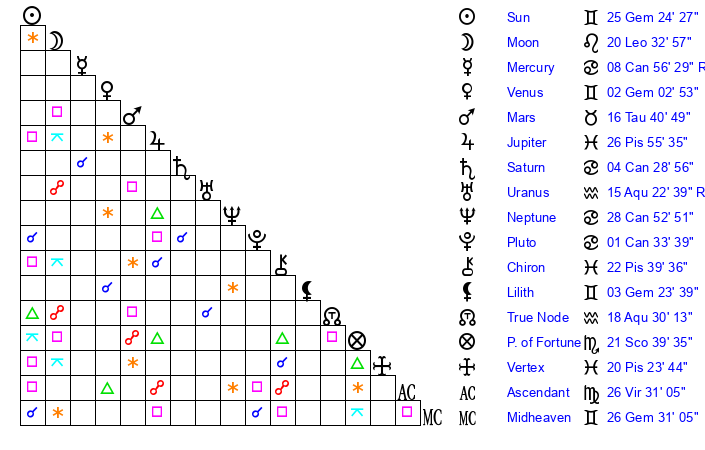 | Sun | 25 Gemini 24 | 26 Gemini 45 | 11 Libra 22 |