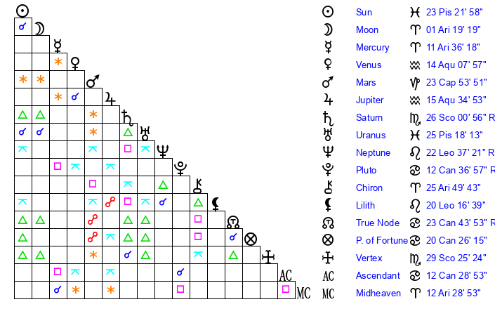 | Mercury | 11 Aries 36 | 9 Aries 34 | 17 Cancer 55 |