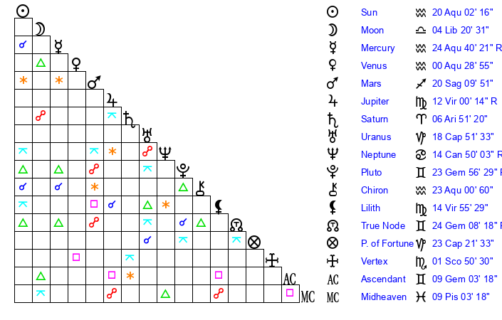 | Sun | 20 Aquarius 2 | 20 Aquarius 54 | 14 Gemini 5 |