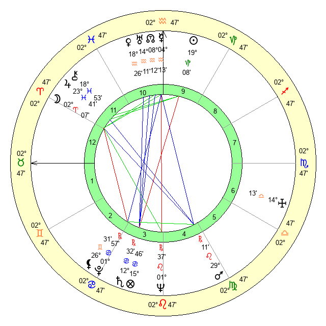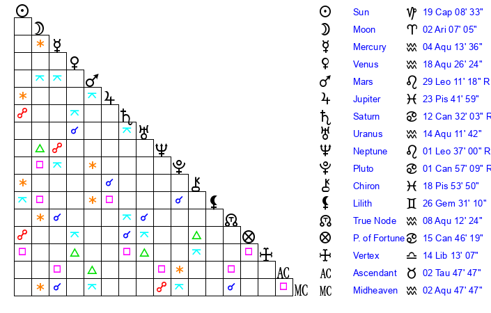 | Uranus | 14 Aquarius 9 | 23 Taurus 27 | 19 Aquarius 22 |