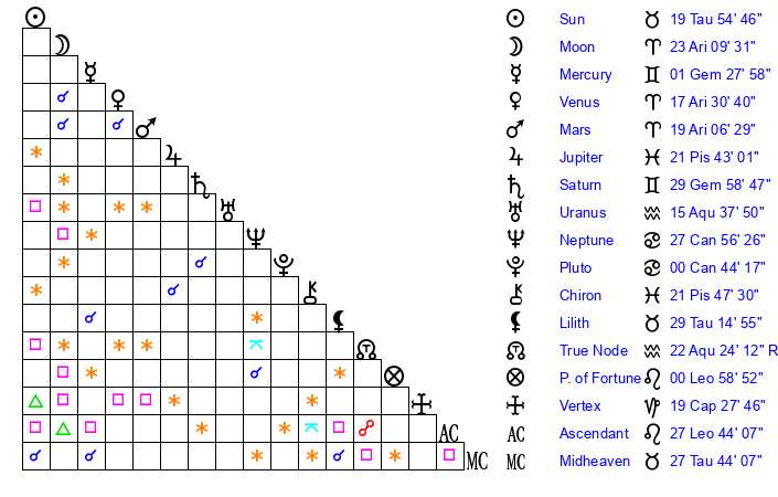 | Sun | 19 Taurus 54 | 21 Taurus 15 | 5 Virgo 15 |