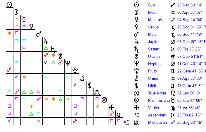 | Saturn | 9 Pisces 53 | 25 Pisces 26 | 22 Pisces 38 |