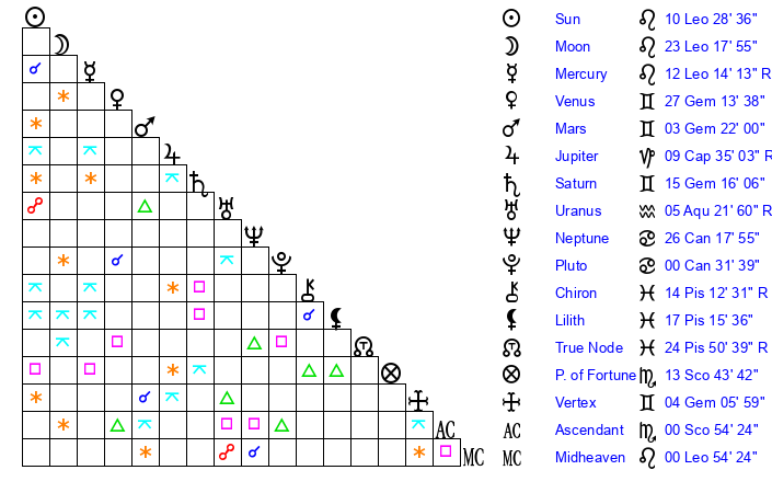| Sun | 10 Leo 28 | 11 Leo 22 | 0 Sagittarius 34 |