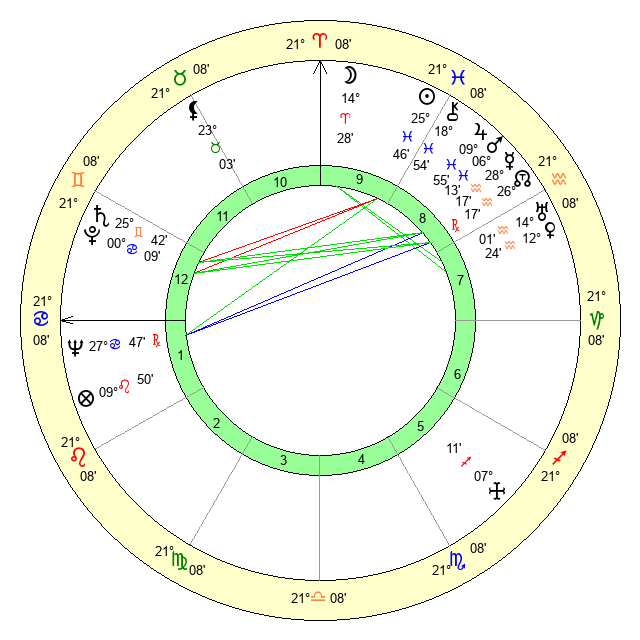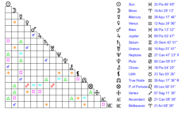 | Sun | 25 Pisces 46 | 27 Pisces 6 | 12 Cancer 19 |
