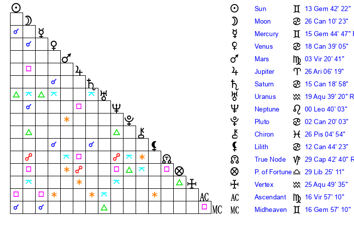 | Sun | 13 Gemini 42 | 14 Gemini 19 | 28 Virgo 21 |