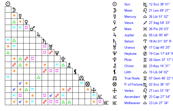 | Sun | 12 Scorpio 39 | 13 Scorpio 32 | 10 Pisces 15 |