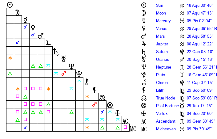 | Sun | 18 Aquarius 0 | 19 Aquarius 10 | 18 Gemini 51 |