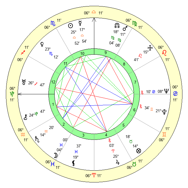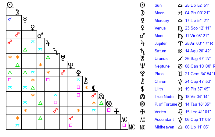 | Sun | 25 Libra 53 | 26 Libra 34 | 28 Aquarius 23 |