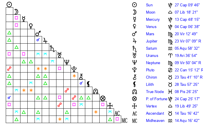 | Moon | 7 Libra 17 | 12 Virgo 30 | 0 Pisces 32 |