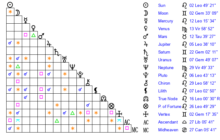 | Moon | 2 Gemini 35 | 27 Leo 48 | 2 Gemini 44 |