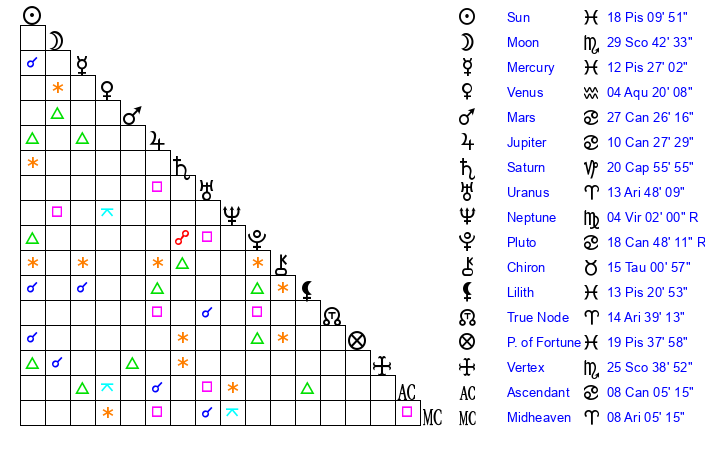 | Moon | 29 Scorpio 40 | 26 Cancer 47 | 27 Aries 25 |