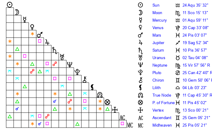 | Sun | 24 Aquarius 35 | 26 Aquarius 0 | 22 Taurus 29 |