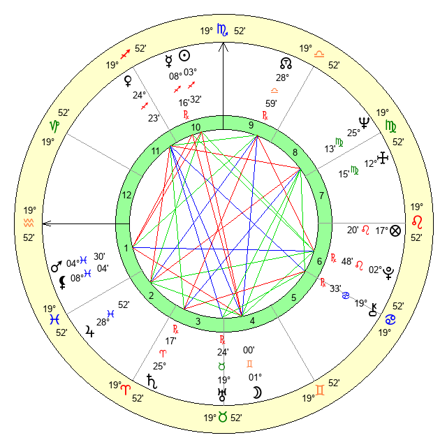 | Moon | 1 Gemini 2 | 15 Aquarius 58 | 23 Cancer 10 |