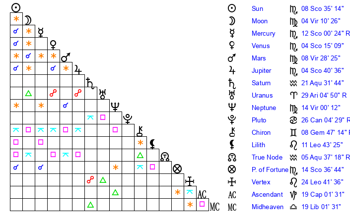 | Sun | 8 Scorpio 35 | 9 Scorpio 31 | 10 Aquarius 54 |
