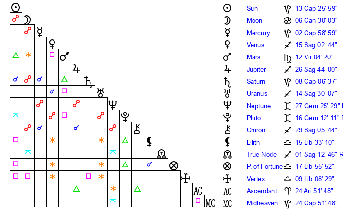 | Jupiter | 26 Sagittarius 32 | 12 Gemini 51 | 12 Capricorn 41 |