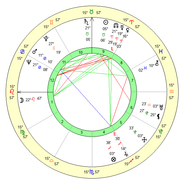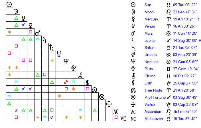 | Moon | 22 Leo 54 | 6 Aries 0 | 16 Libra 40 |