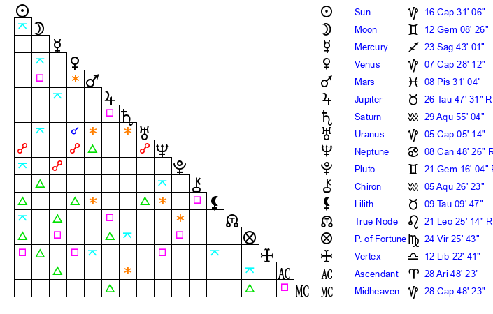 | Sun | 16 Capricorn 31 | 17 Capricorn 24 | 16 Taurus 13 |