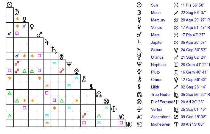| Sun | 11 Pisces 57 | 13 Pisces 7 | 11 Cancer 30 |