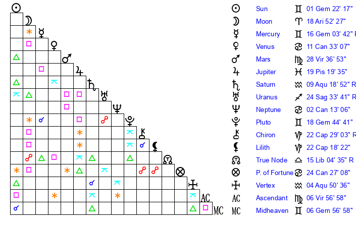 | Moon | 18 Aries 49 | 14 Aries 51 | 18 Libra 41 |