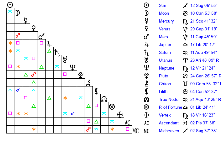 | Sun | 12 Sagittarius 7 | 12 Sagittarius 48 | 15 Pisces 26 |