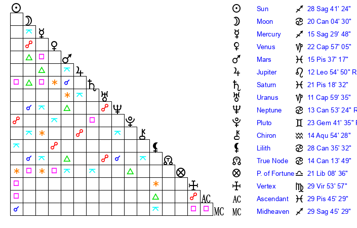 | Sun | 28 Sagittarius 42 | 0 Capricorn 5 | 27 Aries 16 |