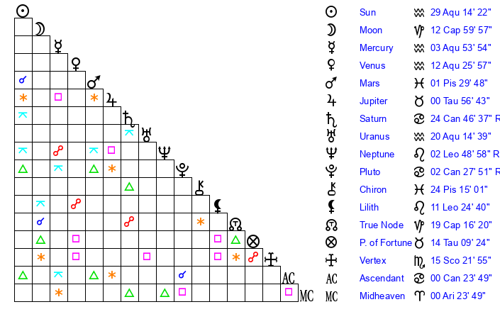 | Sun | 29 Aquarius 14 | 0 Pisces 2 | 15 Gemini 8 |