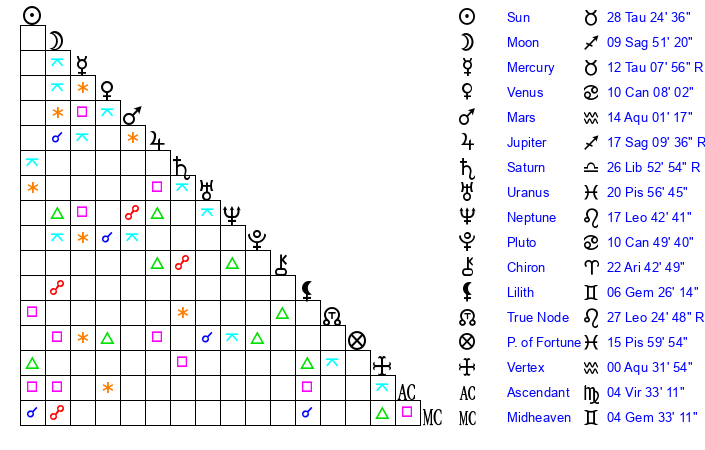 | Jupiter | 16 Sagittarius 53 | 25 Gemini 17 | 10 Sagittarius 32 |