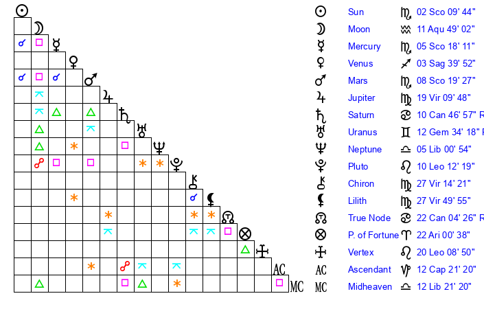 | Moon | 11 Aquarius 51 | 18 Sagittarius 11 | 0 Aquarius 35 |