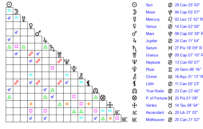 | Moon | 4 Capricorn 57 | 13 Cancer 16 | 6 Taurus 42 |